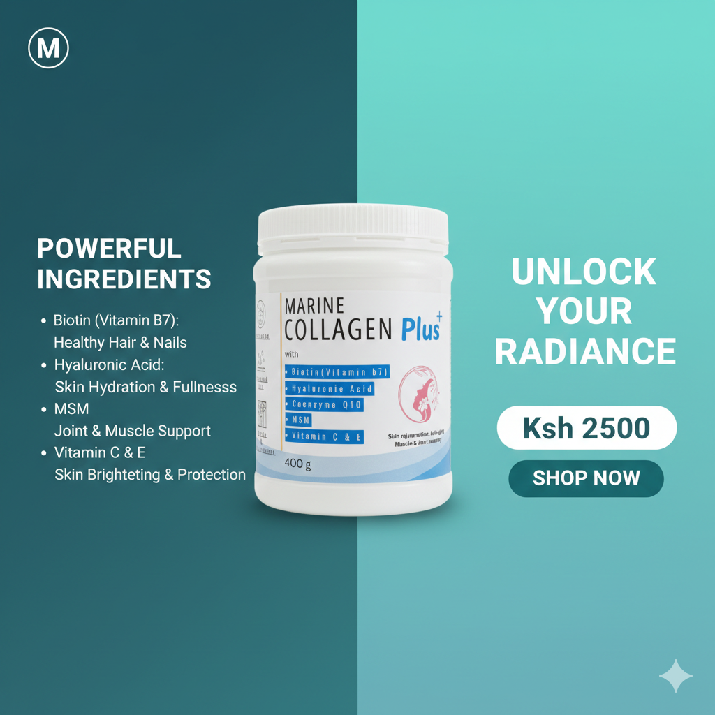 Marine Collagen Plus is a comprehensive beauty and joint support formula designed to rejuvenate the body from the inside out. This advanced blend combines high-quality marine collagen with MSM, hyaluronic acid, biotin, Coenzyme Q10, and vitamins C & E to support skin structure, hydration, elasticity, and musculoskeletal recovery. In fact, these ingredients are expertly blended as Marine Collagen with Biotin and Hyaluronic Acid for optimal results. If you’re searching for effective Marine Collagen with Biotin and Hyaluronic Acid in Kenya, this supplement could meet your needs. Furthermore, many people are seeking Marine Collagen with Biotin and Hyaluronic Acid Kenya to support their beauty and joint routines.